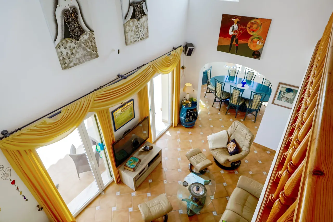 Über den Eingangsbereich mit Gästetoilette, Garderobe und Treppenaufgang zum Obergeschoss betreten wir das Wohnzimmer mit doppelter Deckenhöhe und Zugang zu einer überdachten Terrasse mit anschließender Poolterrasse. Rechter Hand schließt das Esszimmer mit amerikanischer Küche und Zugang zu der Poolterrasse an. Linker Hand befindet sich ein kleiner Verteiler zu einem Gästezimmer und dem Hauptschlafzimmer mit Duschbad en Suite.