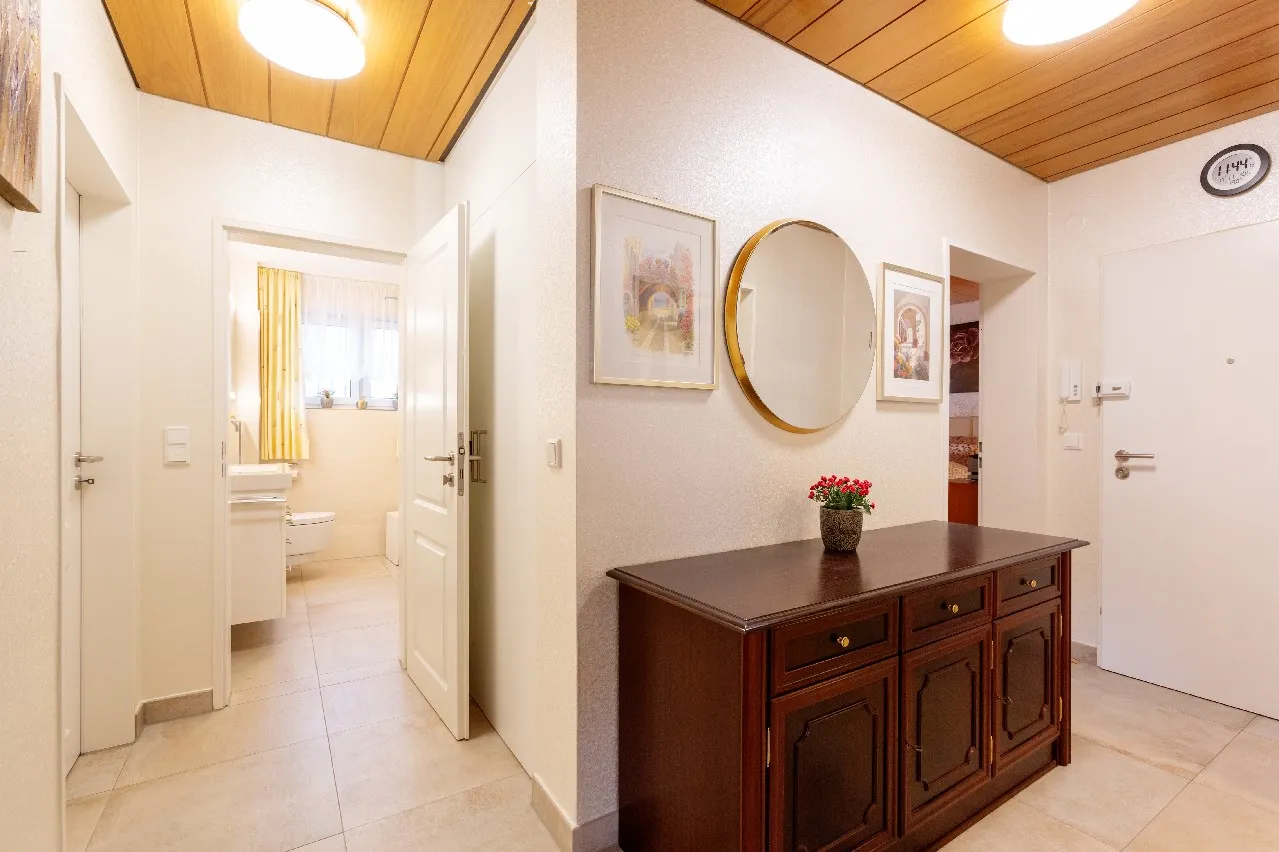 Diese Wohneinheit hat eine Wohnfläche von ca. 80 m², besteht aus drei Zimmern und hat eine ähnliche Aufteilung, wie die Erdgeschoss-Einheit. Auch diese Wohnung verfügt über einen großen Balkon mit praktischer Überdachung. Dadurch wird die Nutzung des Balkons zu jeder Jahreszeit deutlich erweitert. Von hier aus hat man einen herrlichen Blick in den Garten und auf die gepflegte Umgebung. Diese Wohnung ist noch bis Ende Januar 2026 vermietet, somit sind dazu im Exposé keine Fotos zu finden.