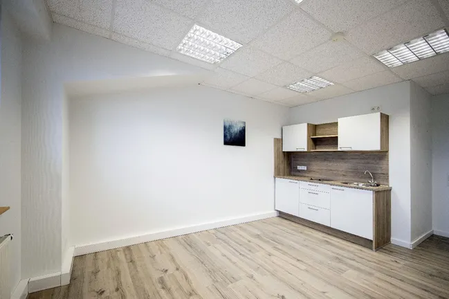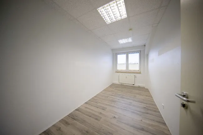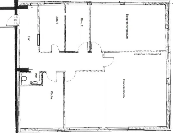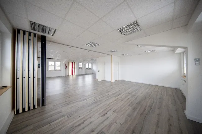 Die Fläche teilt sich auf in ein Großraumbüro das durch eine variable Trennwand noch ein zusätzliches Büro oder ein Besprechungsraum schaffen kann. Außerdem befindet sich auf der ca. 150 m² großen Fläche ein Pausenraum mit Küche, ein WC, ein Flur und 2 weitere Büros.
