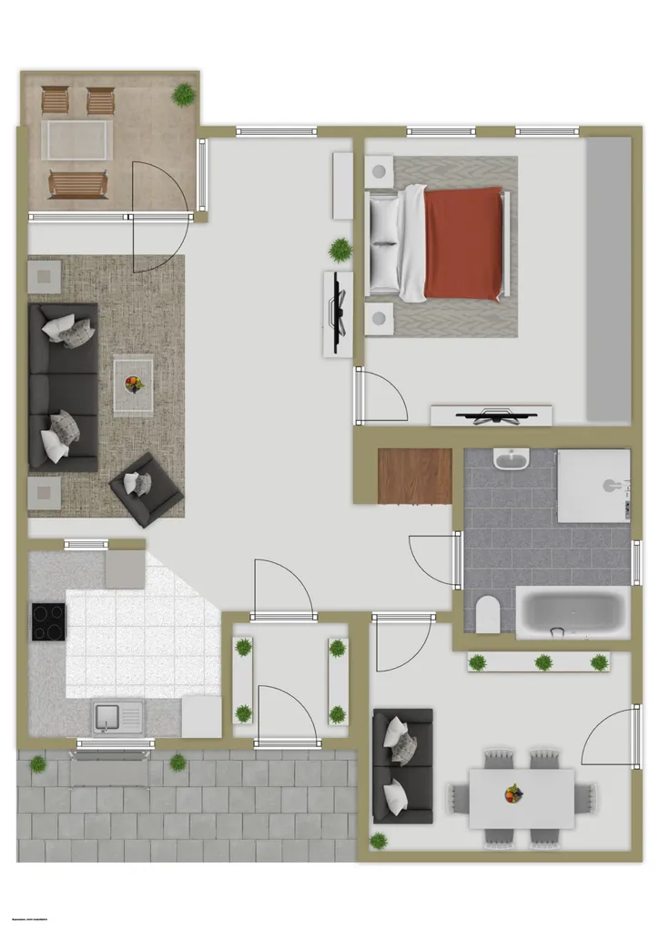Der offen gestaltete Wohn- und Kochbereich schafft mit seinem direkten Zugang zur überdachten Terrasse eine harmonische Verbindung zwischen Innen und Außen. Hier lässt sich der Alltag ganz entspannt genießen – sei es beim Frühstück in der Morgensonne oder beim Glas Wein am Abend. Das Schlafzimmer strahlt Ruhe und Geborgenheit aus, während ein weiteres, flexibel nutzbares Zimmer Raum für Ihre persönlichen Bedürfnisse bietet – etwa als Homeoffice, Hobbyraum oder Gästezimmer. Das moderne Tageslichtbad mit Badewanne und separater Dusche vereint Komfort mit Funktion und sorgt für tägliche Wohlfühlmomente.