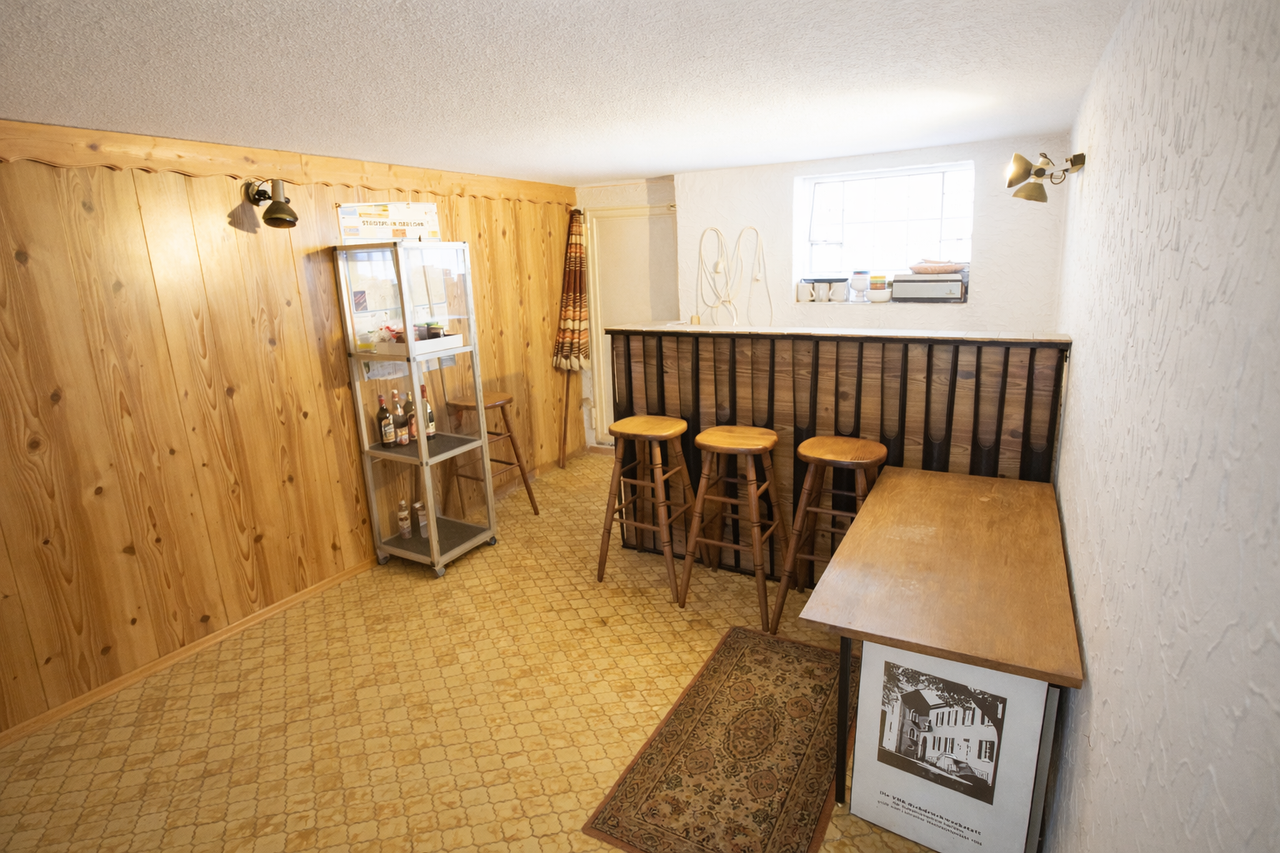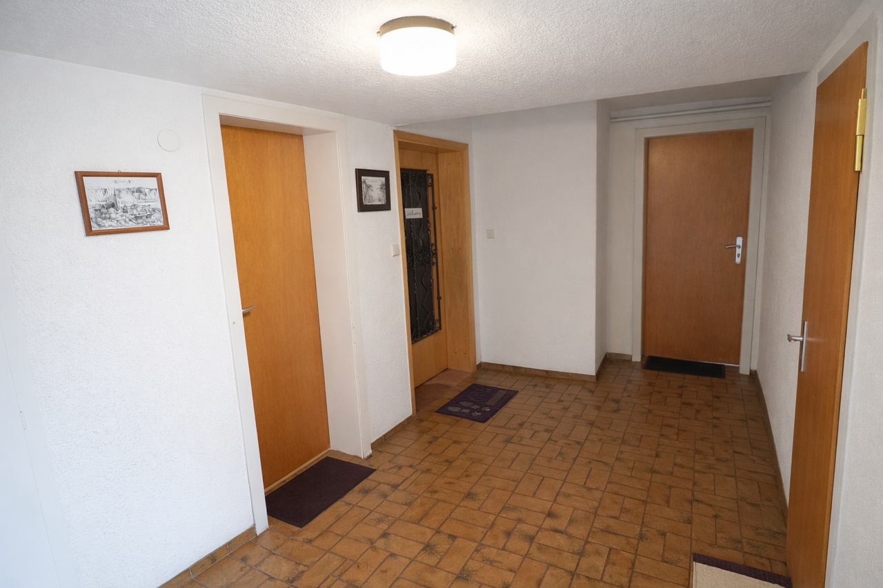 Über einen zentralen Hauszugang mit vorgelagertem Vorflur sind zwei voneinander getrennte Wohneinheiten erreichbar. Zudem befinden sich im Erdgeschoss noch zwei hintereinanderliegende, separate Räume sowie ein Tageslichtbad mit Badewanne. Von einem dieser separaten Räume gelangen Sie auf eine überdachte Terrasse sowie in den rückseitigen Garten.