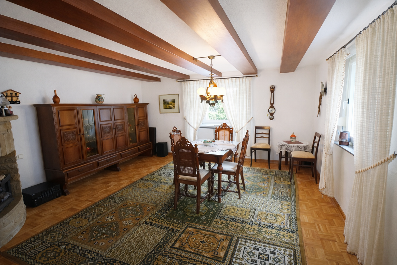 Im Erdgeschoss bietet die Wohnung eine Kochküche, ein Schlafzimmer mit Zugang in den Garten sowie einen modern offen gestalteten Wohn-/ und Essbereich mit gemauertem Eckkamin und Holzparkettfußboden.