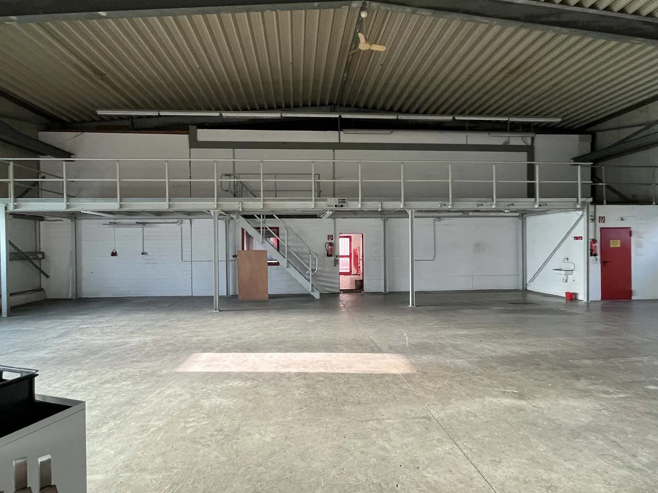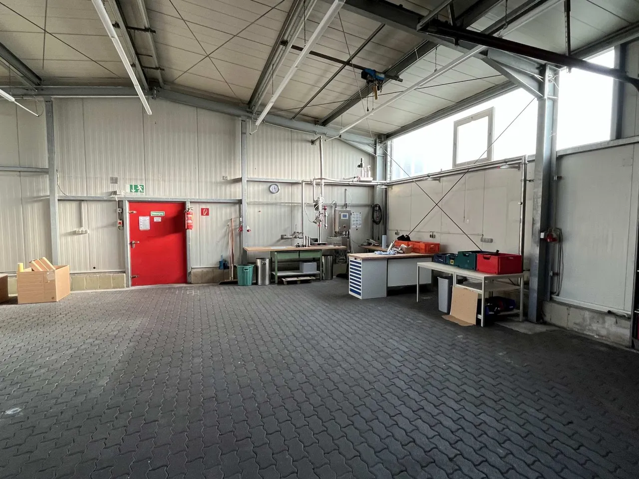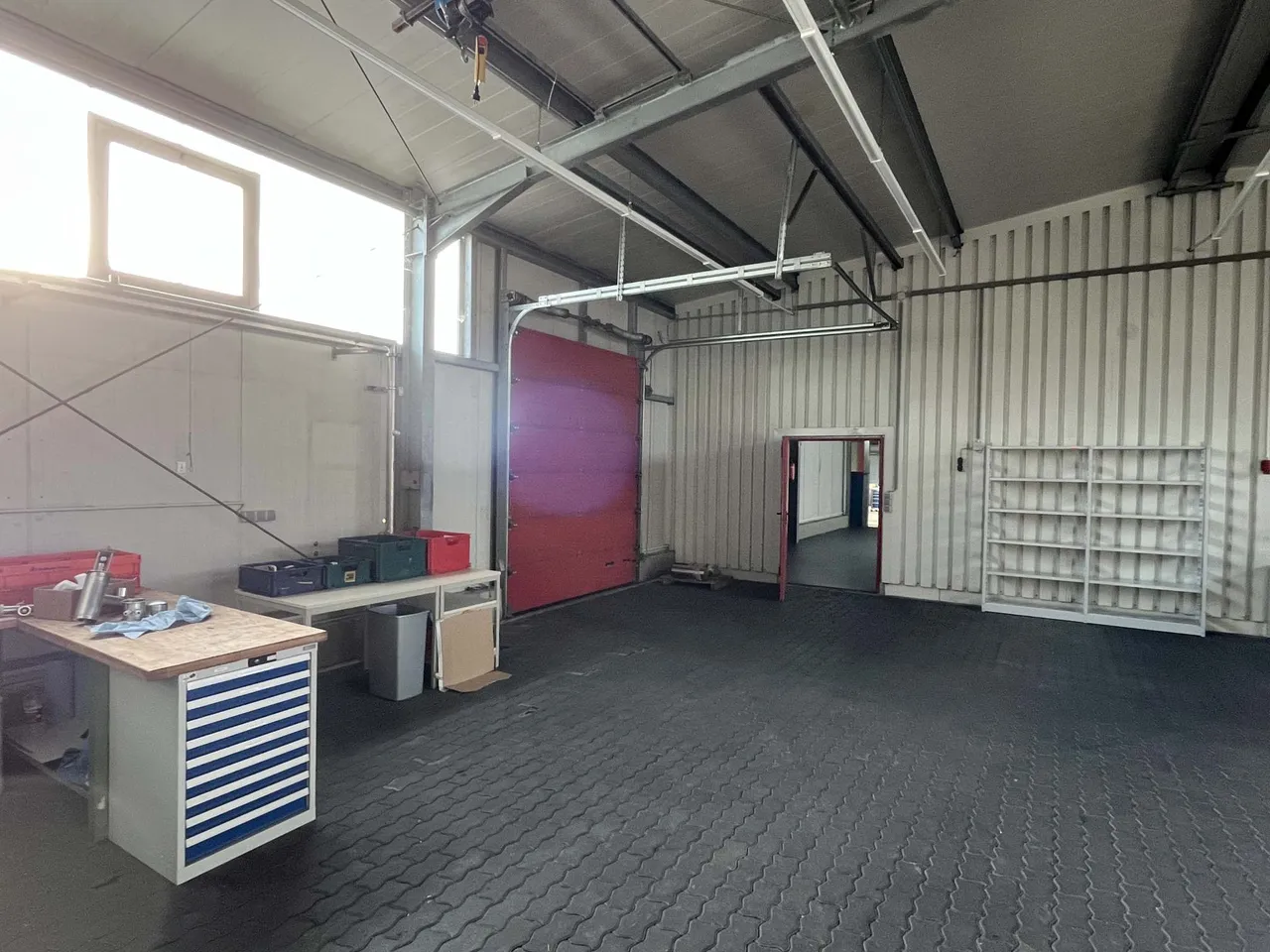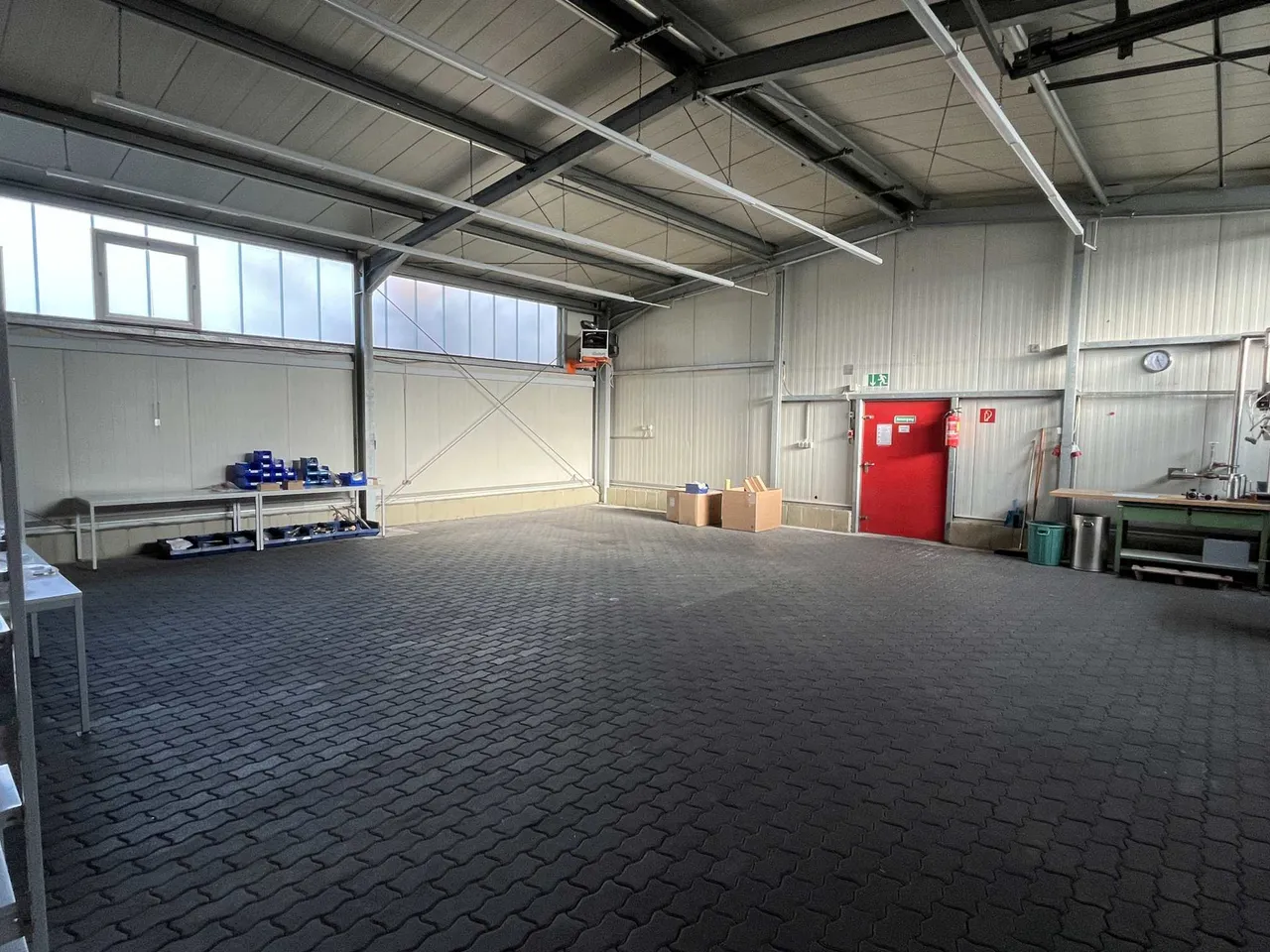 Vom EG aus hat man direkten Zugang zur 331 m² großen Werkhalle. Hier ist ein kleiner Heizraum abgetrennt, über dem Zugang wurde nachträglich noch ein ca. 50 m² großes Hochlager errichtet, welches sich zur Lagerung von Kleinteilen eignet.